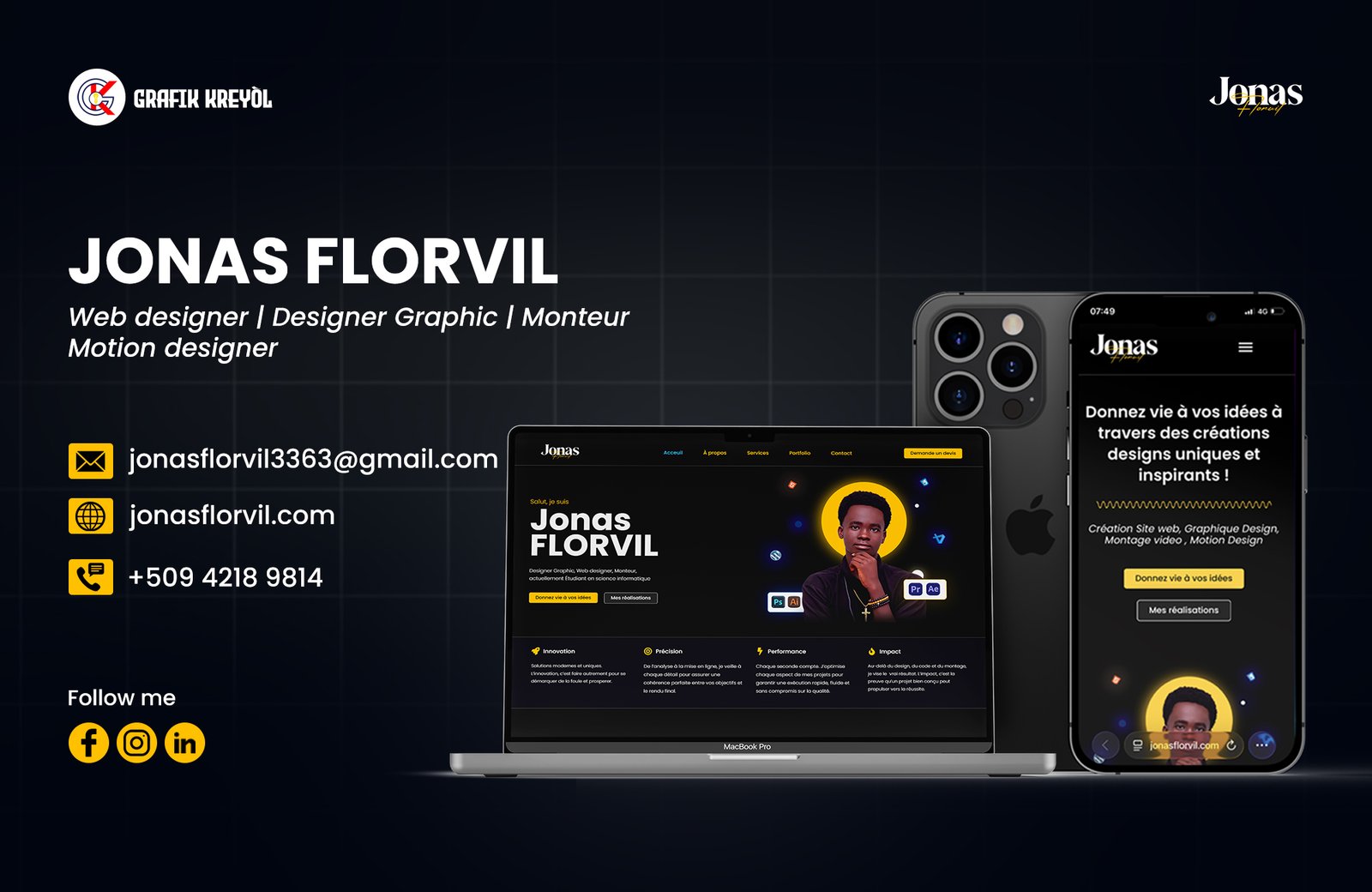 Je suis Jonas FLORVIL Passionné de la création visuelle, j’aime donner vie aux idées à travers des designs percutants, esthétiques et fonctionnels. je me suis spécialisée dans le Design Graphique, web design, montage vidéo, et motion design. Actuellement je suis étudiant en sciences informatiques.